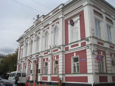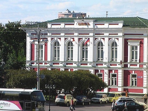Здание банка построено в 1896 году в псевдоклассическом стиле архитектором М.П. Кнопфом. Строение отличается исключительной геометрической четкостью центрального фасада. За счет контрастного цветового решения здание приобрело особую пышную праздничность, характерную для тогдашнего периода русского зодчества.