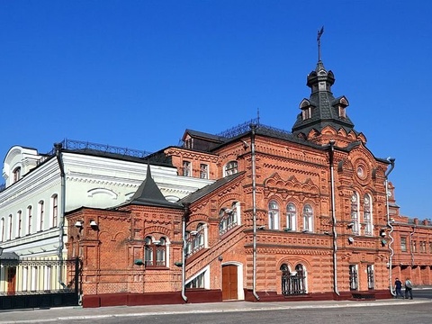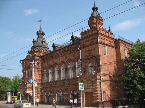 При декорировании фасада обильно использованы разнообразные элементы декора русского зодчества 17 века: пояса кокошников и сложные многорядные карнизы, филенки и ширинки с зубчиками в завершениях, разной формы окна и архивольты. Выразительно обрамление круглого окна в большом ризалите – концентрические ряды выложенного в кирпиче орнамента образуют мотив наподобие средневековой «розы». Поднимающиеся над ризалитами шатровые венчания включают пояски мелких щипцов и кокошников, восьмерички разного диаметра, декоративные машикули и слухи; грани шатров имеют чешуйчатую поверхность. Главный вход находился прежде на левом фланге северного фасада, в настоящее время осуществляется с площади.