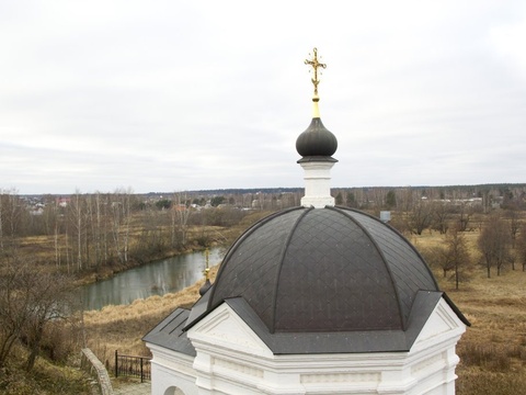 Свято-Благовещенский монастырь, изначально существовавший как мужской, был основан Сергием Радонежским в 1358 году на крутом, живописном берегу реки Киржач. Здесь и правда красиво. Есть смотровая площадка рядом с часовней. Отсюда открываются панорамные виды на реку с торчащей на переднем плане макушкой часовни (сама она внизу). И отсюда же наиболее выигрышно смотрится весь ансамбль монастыря.