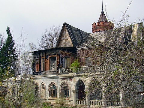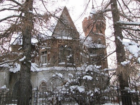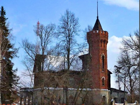 Особую эффектность главному дому придает западная восьмигранная башня, украшенная сверху поясом зубцов на машикулях (навесные бойницы, расположенные в верхней части крепостных стен и башен). Завершается башня шатром из поливной черепицы.