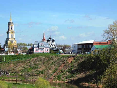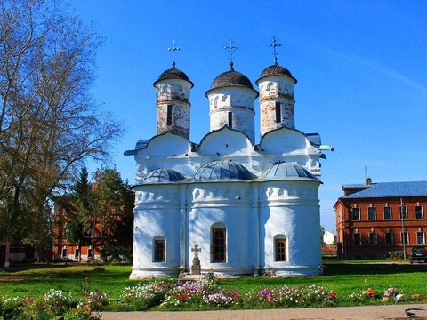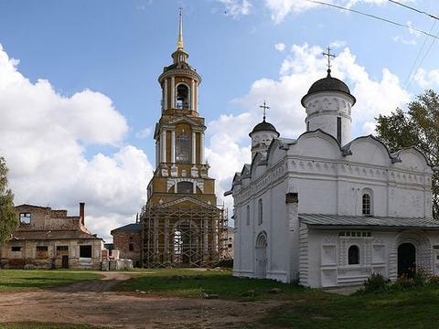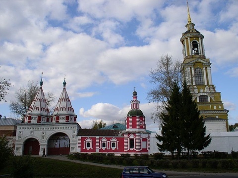 Ризоположенский монастырь, построенный в 1207 году, один из старейших на Руси. К сожалению, постройки ранее 16 века не сохранились. Самым старинным зданием монастыря является трехглавый Ризоположенский собор 1520-1560 годов. Архитектура этого собора была не совсем традиционна для того времени. Бесстолпный четверик был перекрыт крещатым сводом, из-за чего на лишенную внутренних опор кровлю пришлось ставить облегченные главы, более тонкие и высокие, чем это было принято. Стены собора разделены пилястрами на три части; в центральной части - перспективные порталы. Южный портал украшен полуколонками с "дыньками", а северный - белокаменными вставками.