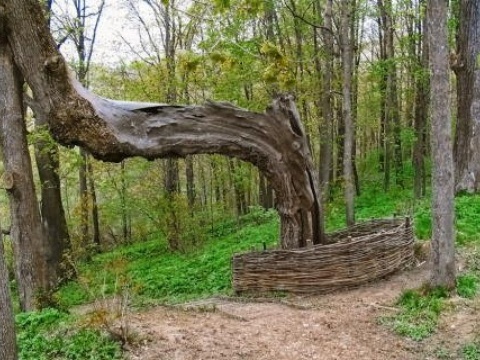 В саду есть необычный дуб. После удара молнии, он упал и прирос к соседнему вязу, получилась интересная арка. Под ней загадывают желание.