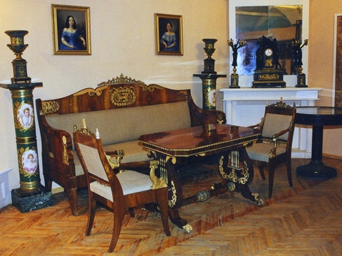 Интересна коллекция дворянской мебели усадьбы Устиново. В одном из залов вывешена картина выполненная в технике монахинь Сретенского монастыря - резьба по пробке с использованием стеклянных трубочек