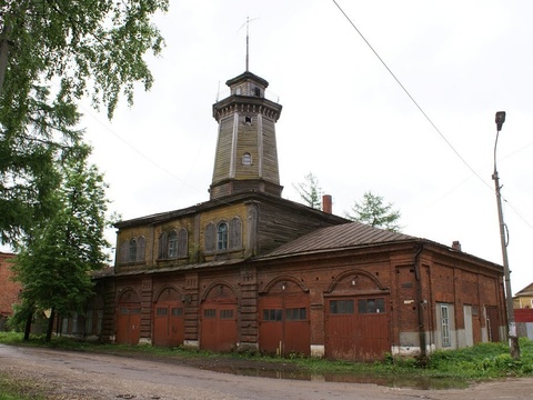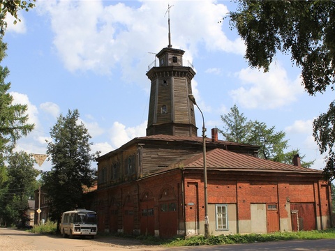Деревянная пожарная каланча. Первая добровольная пожарная дружина. Памятник истории и архитектуры. По прежнему действующая пожарная станция.