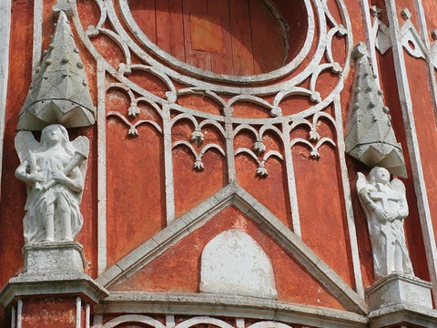 Храм настоящее украшение усадьбы и всей деревни. Сразу видно, что Полторацкий не пожалел денег на его строительство. Красивый, высокий храм построен в псевдоготическом стиле и с элементами готики в декоре фасада. Фасад украшен ажурным белокаменным орнаментом, стрельчатыми арками, остроконечными башенками и статуями ангелов. Внутри храм тоже красив, хотя был полностью разграблен в 1930-х годах.
