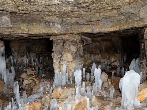 Зимой на полу нарастают красивые ледяные сталагмиты. Если их подсветить фонарем получатся красивые фотографии.