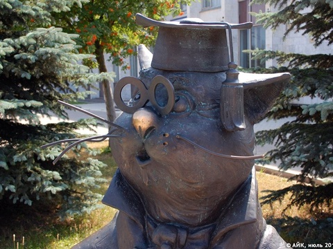 С книжкой и в очках, симпатичный бронзовый котик у Дома ученых.