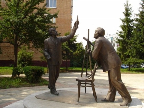 Памятник показывает вымышленную встречу Циолковского, автора фундаментальных трудов по теории космонавтики и Королева, основоположника практической космонавтики.