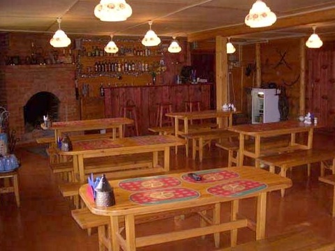 База предлагает коттеджи с 4-7 номерами. В номерах: душ, горячая, холодная вода, туалет, телевизор, холодильник. 1-ый этаж каждого коттеджа оснащен каминным залом и баром.
