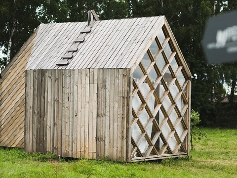 Домики построены из деревянного бруса по проекту архитектурной студии "Мел". Обшиты старой доской снаружи и белой фанерой внутри, утеплены. Спальное место на втором ярусе, одна стена - прозрачная. В домике могут уместиться от 2-х до 4-х людей.